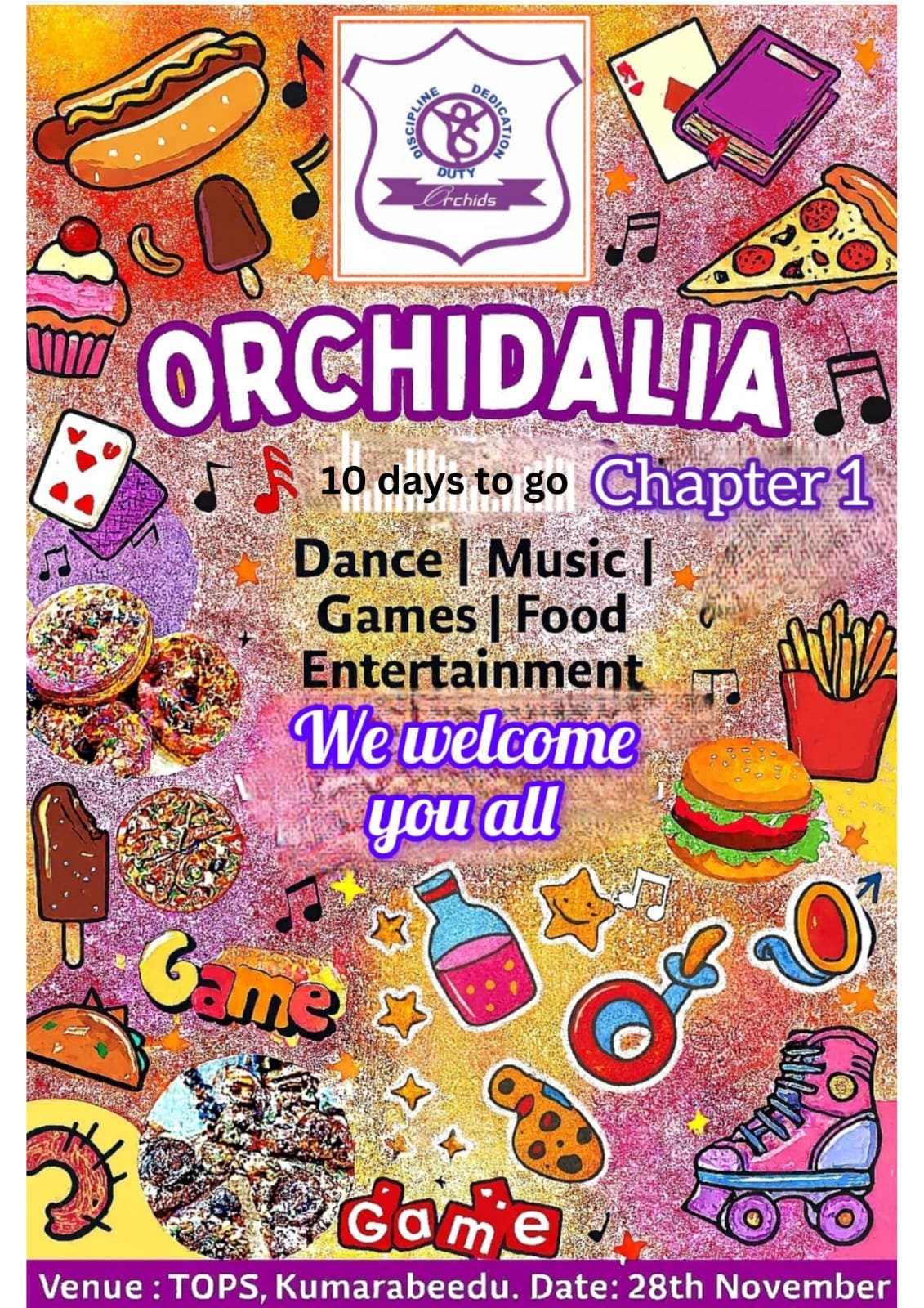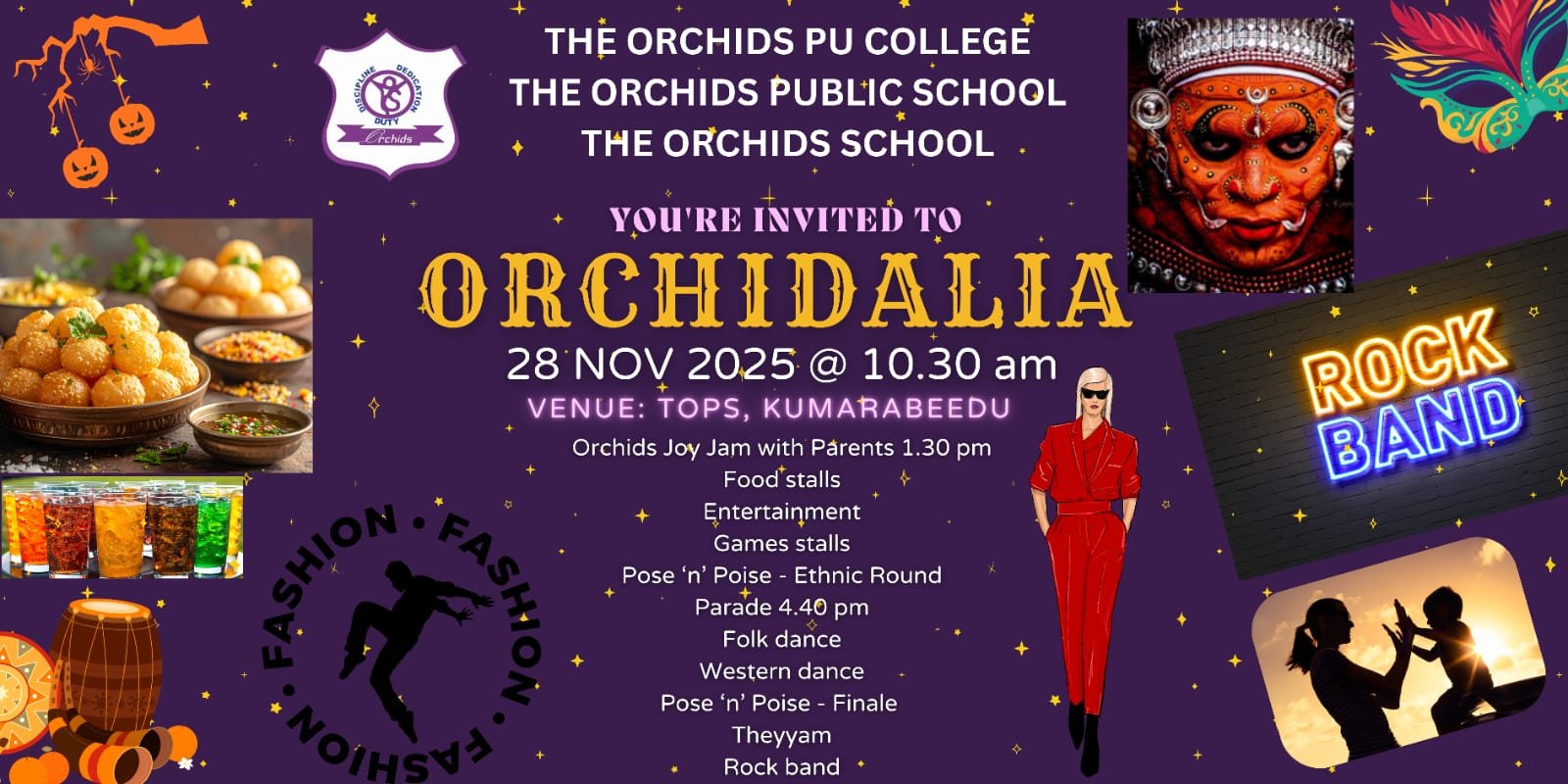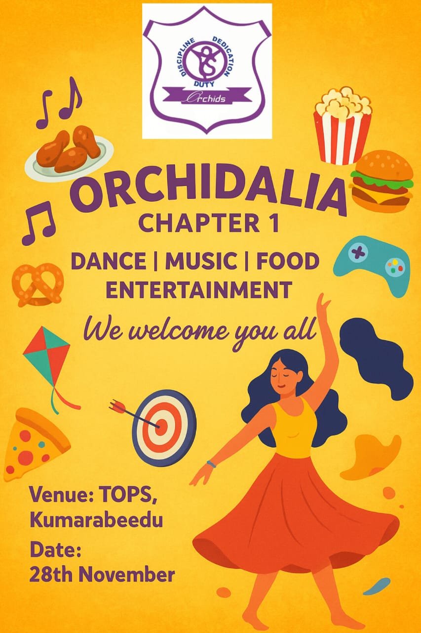 A vibrant cultural celebration hosted by The Orchids PU College, The Orchids Public School, and The Orchids School. The event is scheduled for 28 November 2025 at 10:30 AM, at TOPS, Kumarabeedu.
